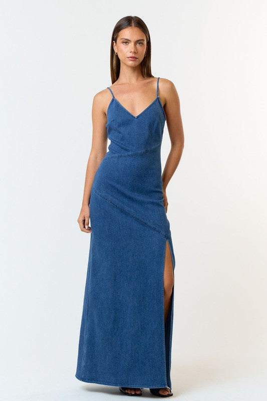 Denim dresses are here to stay and we are loving it! The Blue For You Denim Maxi Dress is a Summer staple! This flattering maxi dress is sleeveless and has a side leg slit. The denim is stretchy and comfortable. It is definitely a dress you can dress up or down depending on your mood!
